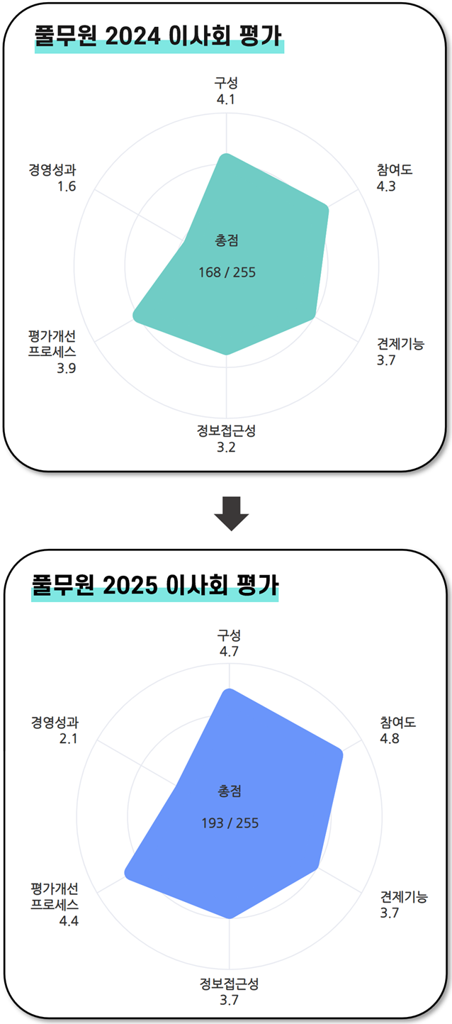 풀무원은 2025년 이사회 평가 결과 255점 만점에 193점을 취득했다. 지난해 168점에서 25점이 플러스됐다. 6대 공통지표 중 5개 지표에서 평점이 상승한 결과다. 참여도는 4.3점에서 4.8점으로, 경영성과는 1.6점에서 2.1점으로 올랐다.
