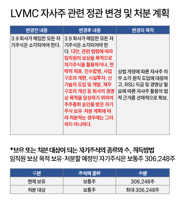 하지만 LVMC는 이달 31일 정기주총에서 '임직원 보상을 목적으로 자사주를 활용하거나 전략적 제휴 등 경영상 목적을 달성하기 위해 소각하지 않을 수 있다'는 내용을 추가하는 안건을 상정했다.