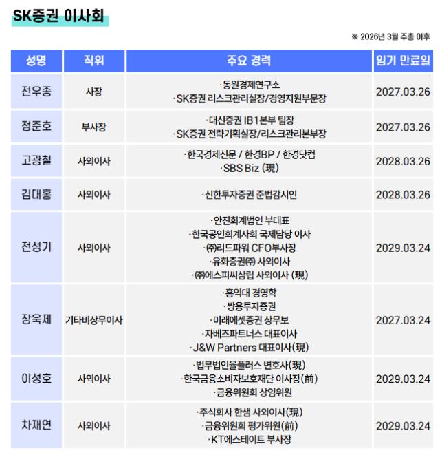 이로써 SK증권 이사회는 총 7명에서 8명으로 늘어났다. 지난해 말 기준 이사회는 전우종, 정준호 사내이사와 고광철, 김대홍, 전성기, 박정림 사외이사, 장욱제 기타비상무이사로 구성돼 있었다. 올해 1월 박정림 전 사외이사가 KB증권 고문으로 되돌아가면서 중도퇴임했다.