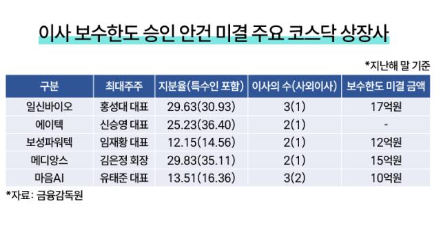 현재까지 코스닥 시장에서 이사 보수한도 승인 안건이 미결된 기업은 일신바이오 외에도 에이텍, 보성파워텍, 메디앙스, 마음AI 등이다. 대부분 일신바이오와 같이 그간 주주인 이사 주도로 관련 안건을 통과시켜온 곳이다. 이달 말까지 정기주총이 계속 이어지는 점을 감안하면 향후 더 추가될 수 있다. 코스닥 시장 관계자는 "최대 20여곳 상장사에서 이사 보수 관련 안건 미결 사태가 일어날 것으로 본다"고 말했다.