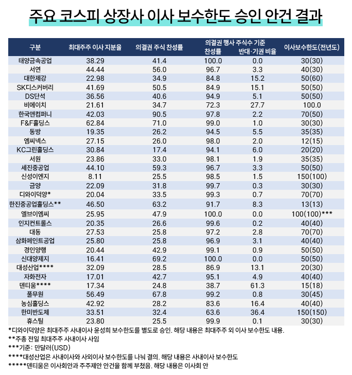 8일 관련업계에 따르면 올해 정기주총을 앞두고 이사 보수한도 승인 안건 부결 가능성이 거론된 코스피 상장사는 30곳에 달했다. 지난해 주총 결과를 기준으로 주주인 이사가 의결권을 행사하지 못한다고 가정할 경우 정족수를 충족하지 못하는 기업들을 추려낸 것이다. △태양금속공업 △