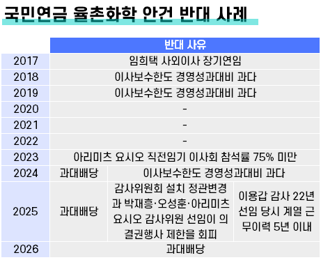 율촌화학 과대배당 지적은 2024년부터 시작돼 올해까지 2년 연속 이어지고 있다. 국민연금은 회사의 재무 상황이나 수익성 대비 배당 규모가 지나치게 크다는 입장을 유지하고 있으며 이 같은 판단은 실제 주총 의결권 행사로도 이어지고 있다.