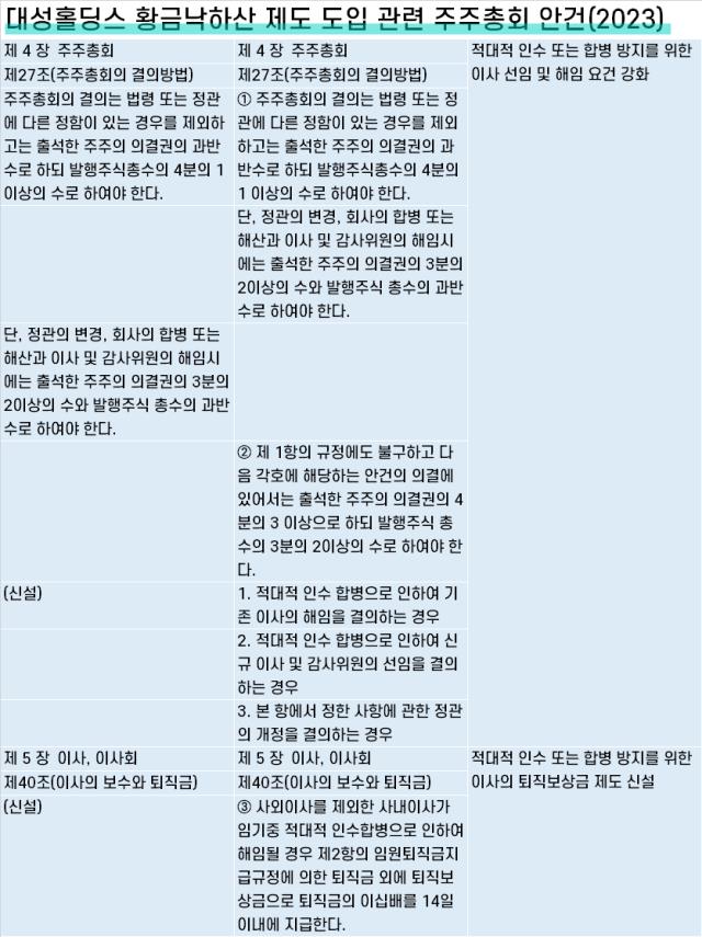 옛 대구도시가스를 뿌리로 둔 대성홀딩스와 대성에너지는 코스피 상장사로서는 드물게 황금낙하산 조항을 유지하고 있다. 계열사인 코스닥 기업 대성창업투자도 마찬가지다. 도입 시기와 지분구조를 봐도 독특하다. 거버넌스 선진화 부담으로 기업들이 경영권 방어 조항을 삭제하던 2023년 해당