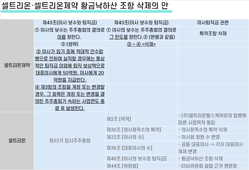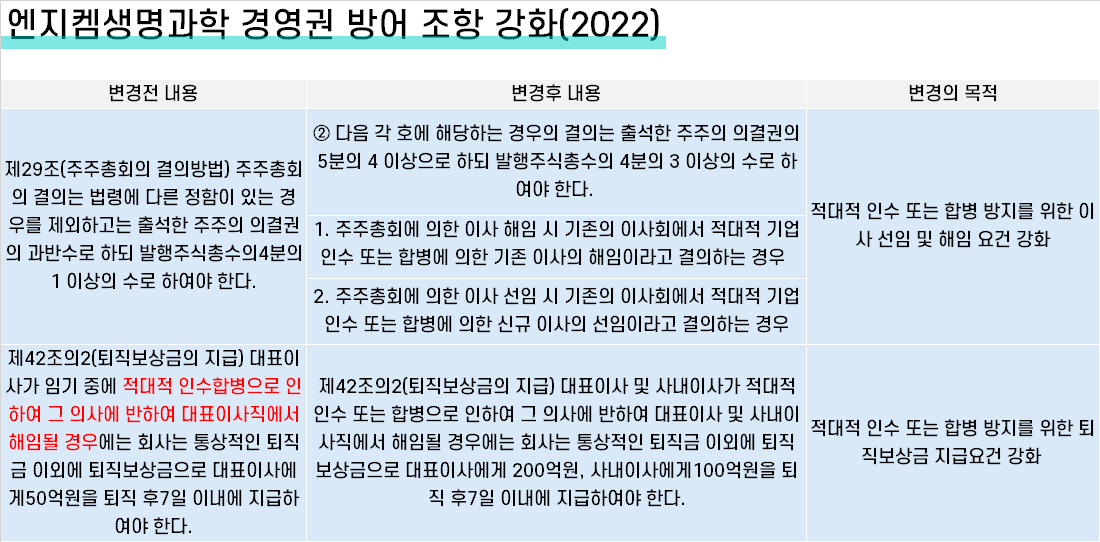 우리나라의 황금낙하산 제도는 인수합병(M&A) 거래의 조건보다는 그 자체를 방어하는 수단으로 쓰인다. 도입 시점부터 임원 보상과 연계된 상법과 이어지면서 도입하려면 정관상 사전에 명시해야하는 조건이 됐다. 특별결의 안건인 만큼 현재 대주주 중심의 참호가 구축될 가능성이 높다.
