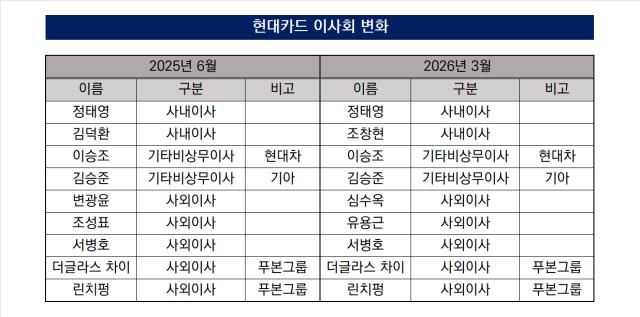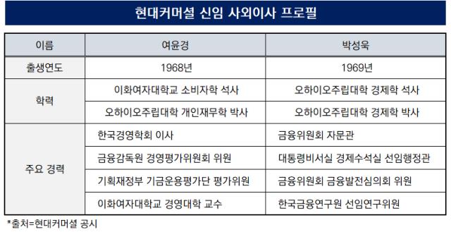 현대커머셜이 사외이사진을 재편한다. 지난해 어피니티 측 교체에 이어 임기 만료 사외이사 두 명을 전면 교체한다. 신임 사외이사 후보로 여윤경 이화여대 경영대학 교수와 박성욱 한국금융연구원 선임연구위원을 추천했다. 이들을 영입하며 거시경제와 재무 분야의 전문성이 한층 강화됐다. 이번 재편은 정책 대응력을 유지하며 거버넌스 체계를 보완하는 데 초점을 맞췄