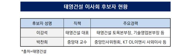 지난해 말 정기인사에서 신임 최고경영자(CEO)로 발탁된 이강석 태영건설 사장이 이사회에 합류한다. 최금락 태영건설 부회장과 함께 재무위원회 위원으로 활동하며 정상화 관련 주요 의사결정에 참여할 전망이다. 사내이사 선임 절차가 마무리되면 워크아웃 중에 있는 태영건설 정상화에 박차를 가할 계획이다. 신규 사외이사로는 경영전략 및 국제경영 전문가로 꼽히는