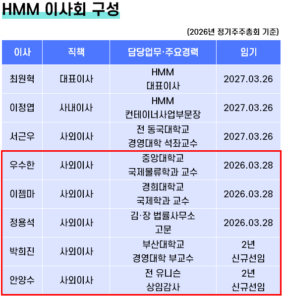 HMM은 오는 정기주주총회에서 부산 이전이나 매각 등 경영 현안과 관련된 안건을 다루지 않는다. 다만 향후 관련 논의를 더욱 수월하게 진행되는 포석이 놓여진다. HMM은 부산 지역에 인적 네트워크를 보유한 인사와 최대주주인 산업은행 출신 인사를 사외이사로 기용하고 사외이사진의 수를 줄일 예정이다. HMM은 오는 26일 정기주주총회에서 정관 변경안건을