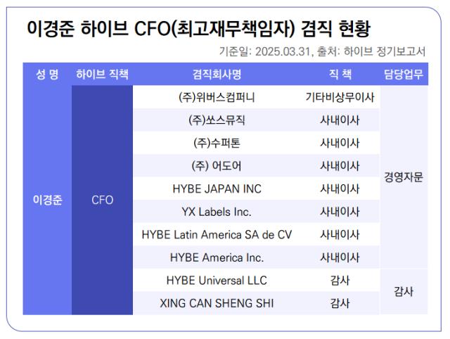 이경준 하이브 CFO(최고재무책임자)가 그룹에서 강력한 존재감을 보이고 있다. 국내외를 통틀어 무려 10개 계열사에 감사와 이사 등 등기임원으로 이름 올린 것으로 확인됐다. 2025년만 해당되는 일이 아니다. 하이브가 상장한 이후부터 6년차인 올해까지 이런 기조가 이어졌다. 이 CFO가 소속되어 있는 계열사는 하이브의 미래성장동력이라는 공통점이 있다.